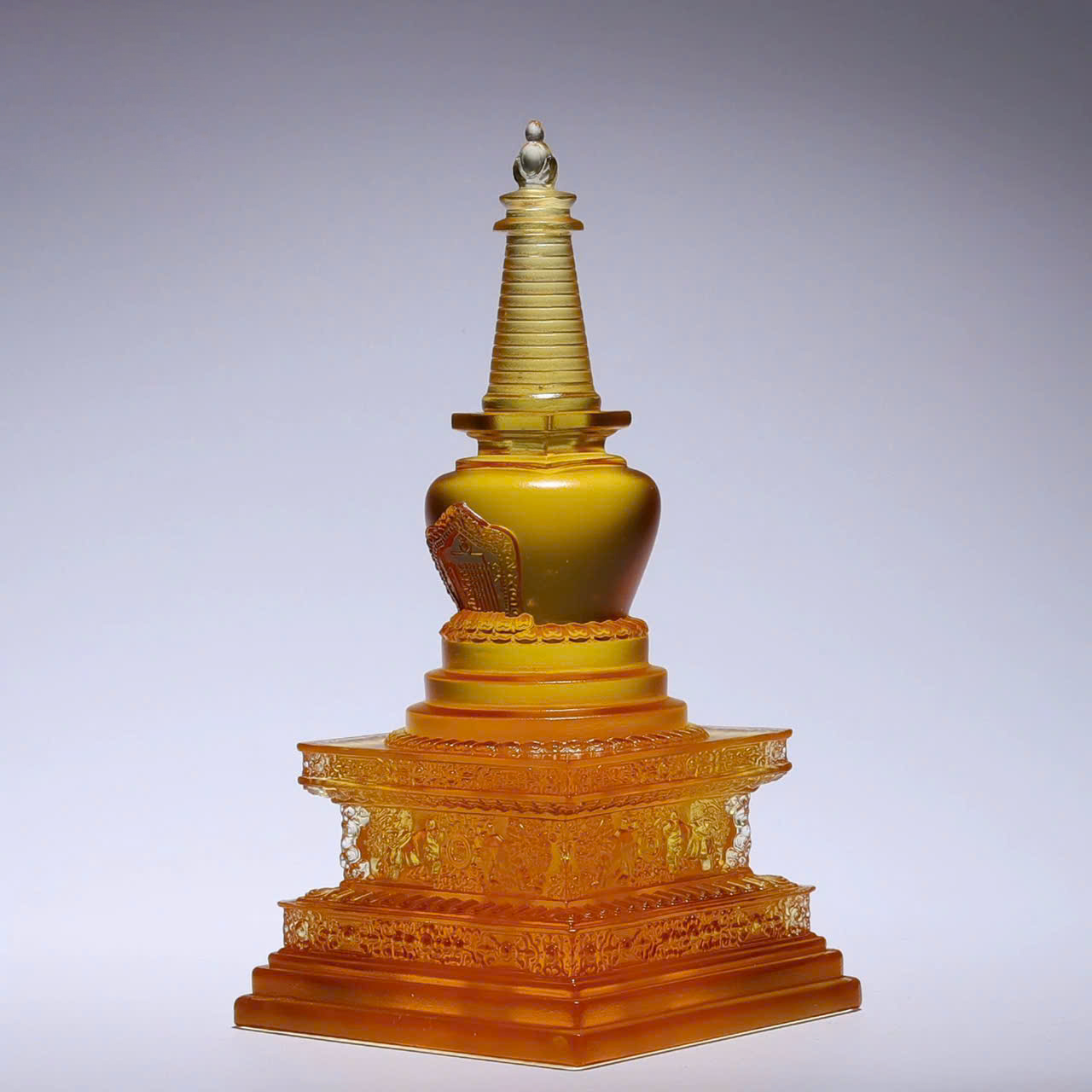 - Điểm đặc biệt của lưu ly là sự hòa quyện của các dải màu. Dưới ánh sáng, tòa tháp hiện lên với những vầng hào quang mờ ảo, thay đổi sắc độ theo từng góc nhìn, tạo nên cảm giác như đang chiêm ngưỡng một bảo vật từ cõi tịnh độ.